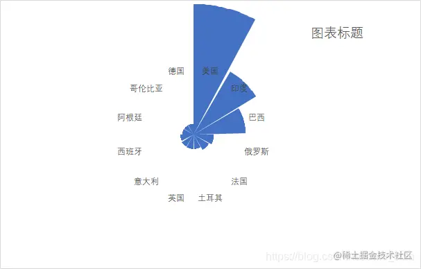这里有12个国家,雷达图是按照极坐标来划分的,那么一个国家在极坐标里的占比就是360/12=30。