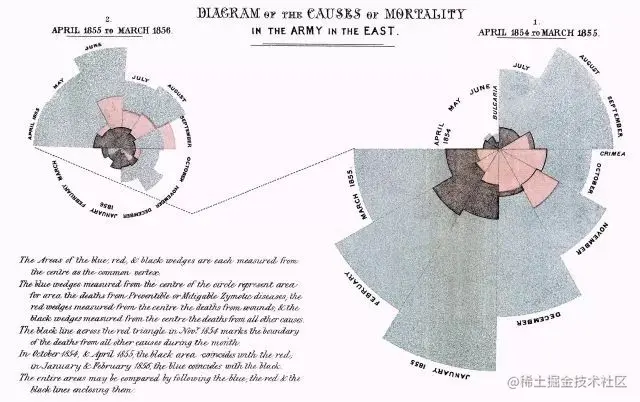 这张图就是南丁格尔当时报告这件事时所用的图表,以表达军医院季节性的死亡率,从整体上来看: 这张图是用来说明、比较战地医院伤患因各种原因死亡的人数,每块扇形代表着各个月份中的死亡人数,面积越大代表死亡人数越多。