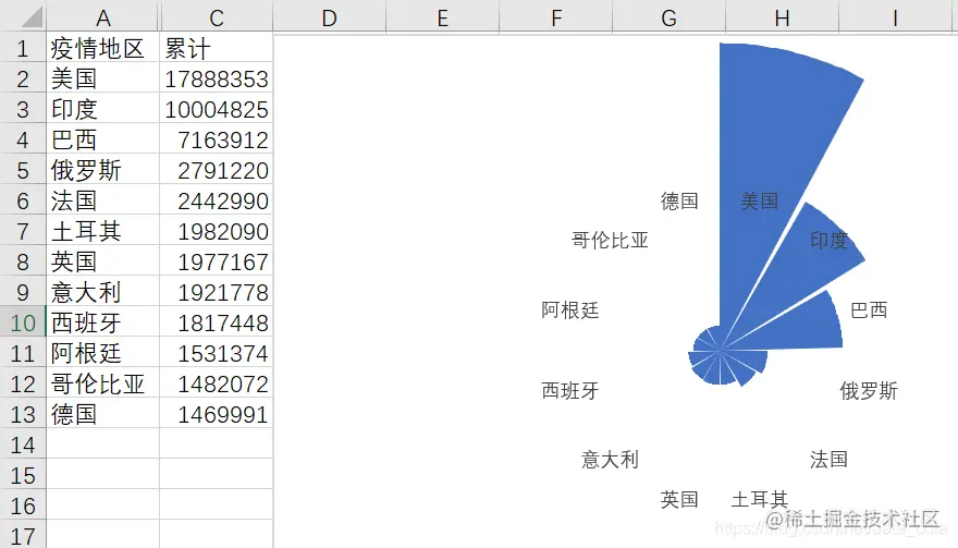 网上有很多用Excel做玫瑰图的教程,不过说实话,没有对比,单纯用一组数据做这个南丁格尔玫瑰图,是为了显摆吗?柱形图它不是更简单直观吗