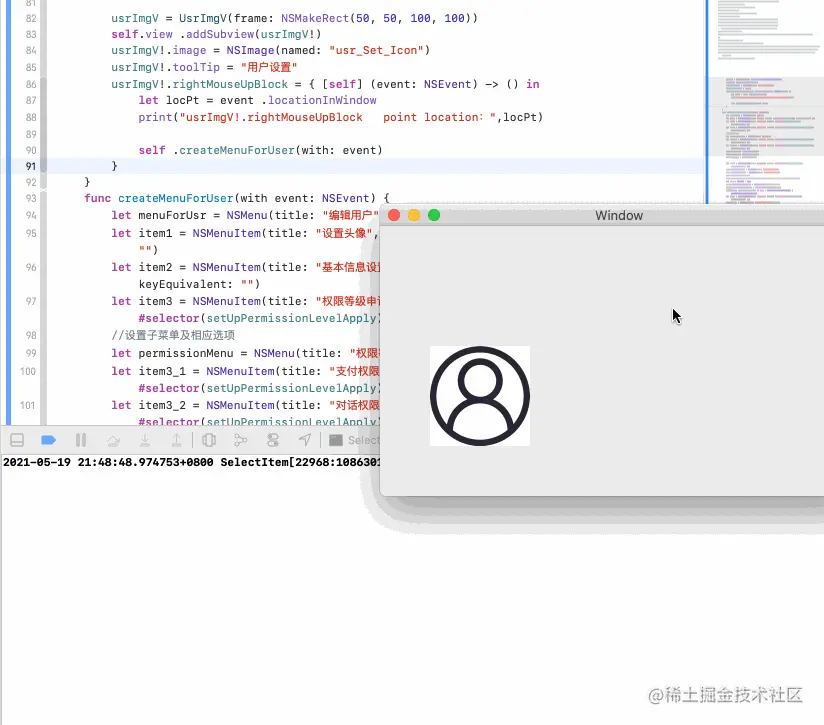 usrImgV中鼠标右键按下时,UsrImgV类的func rightMouseUp(with event: NSEvent)方法、ViewContoller类的func rightMouseUp(with event: NSEvent)方法都会回调(都打印了获取(NSPoint)点的信息——“point location:”和“UsrImgV point location:”)! 菜单的可选项均可选,响应相应的事件! 此时在ViewContoller中的**usrImgV!.rightMouseUpBlock闭包部分有回调**,用返回的NSEvent事件创建NSMenu菜单! - 在