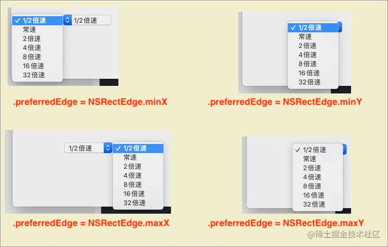 设置弹出菜单的位置:open var preferredEdge: NSRectEdge属性——对应枚举的各项(minX/minY/maxX/maxY)