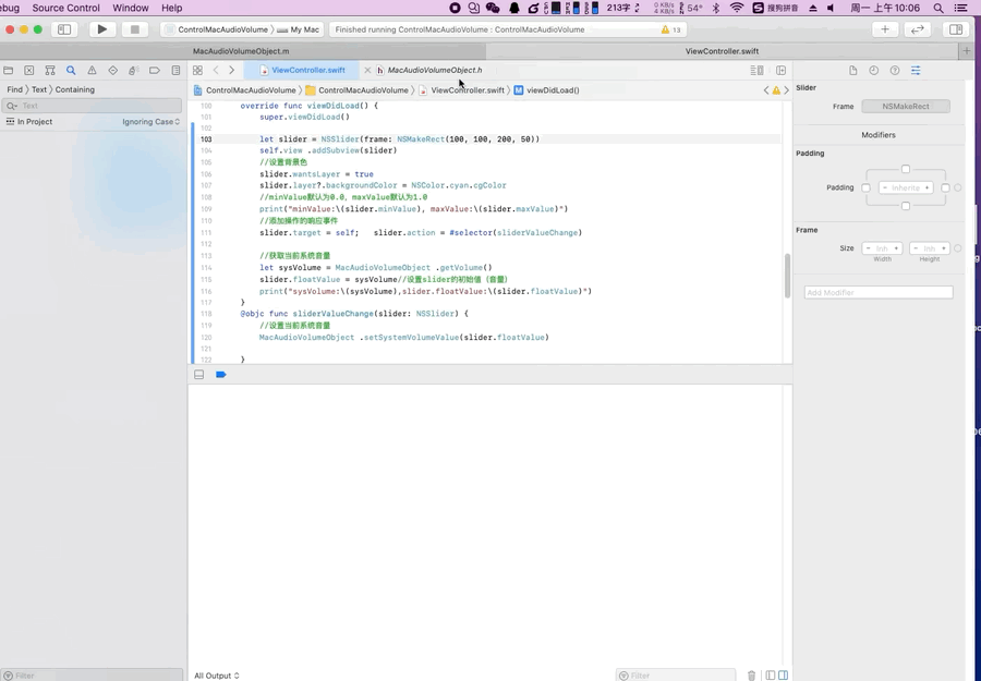之后在Swift代码中就可以使用和操作该OC类(MacAudioVolumeObject)了: