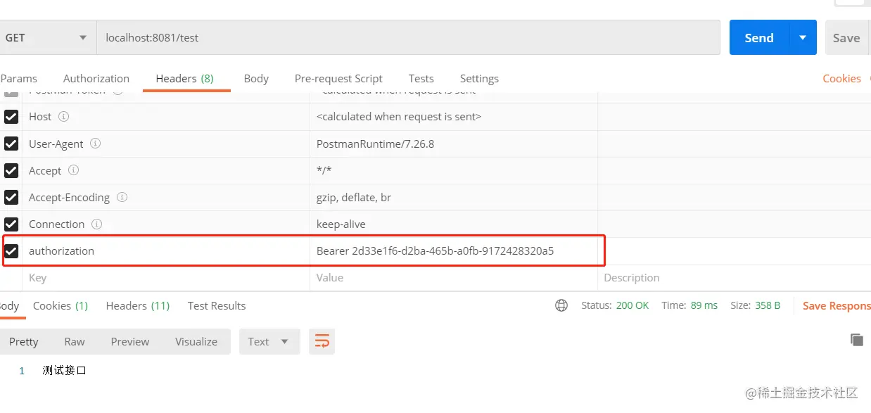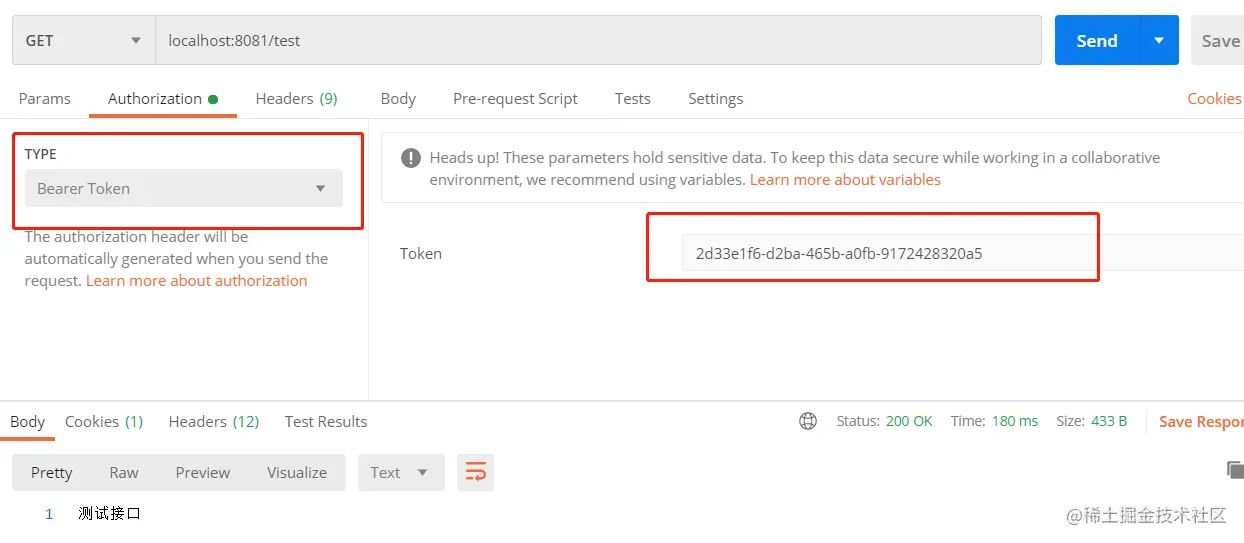 这个时候需要将上面生成的token放入认证信息中,有两种方式,第一种是Postman在Authorization中设置Bearer token