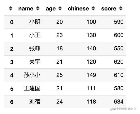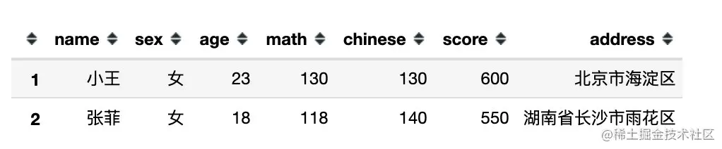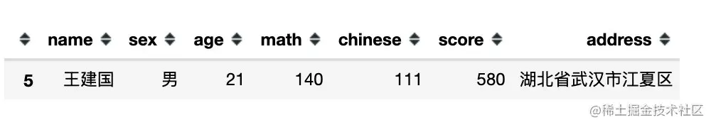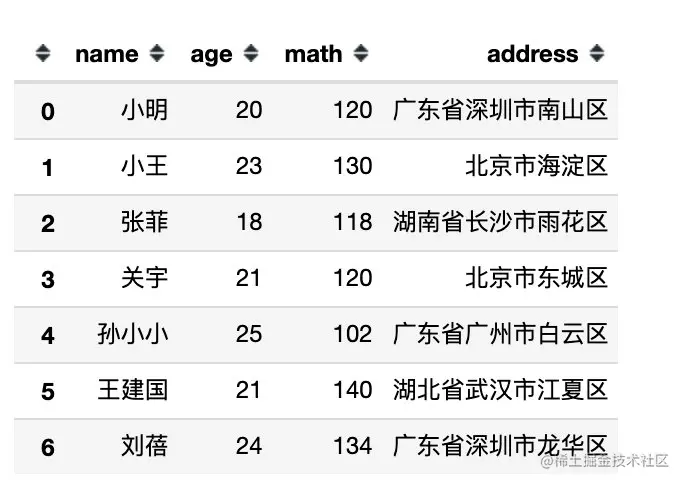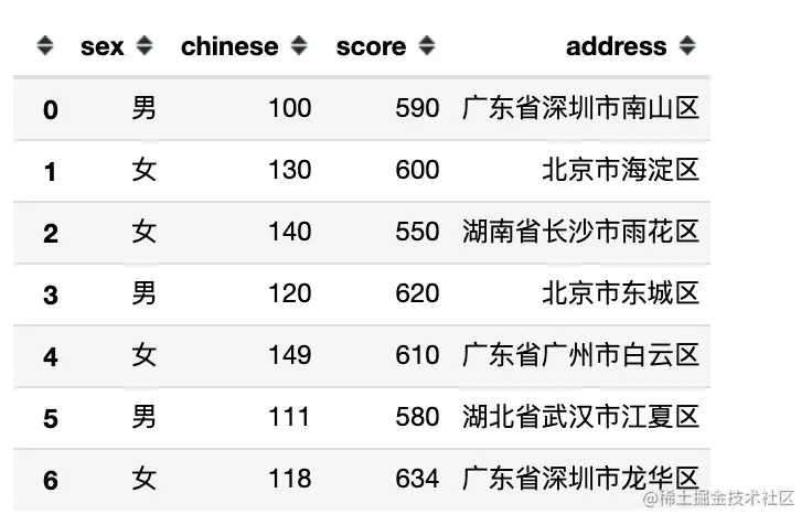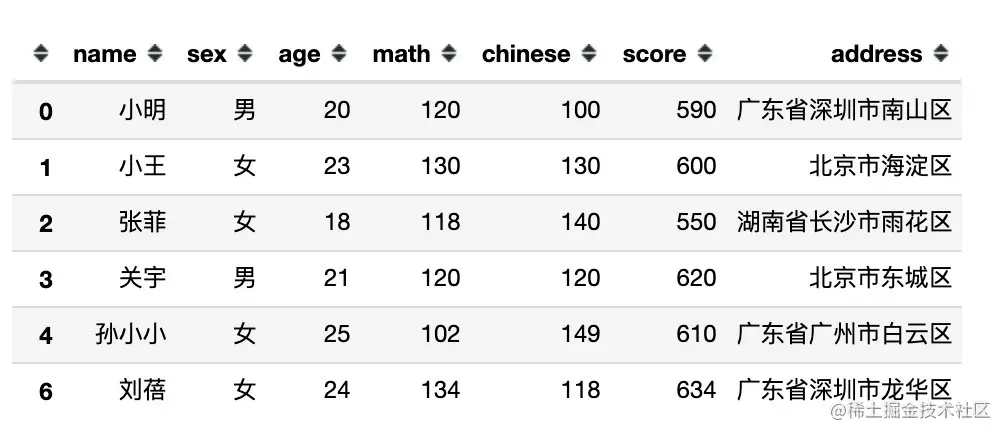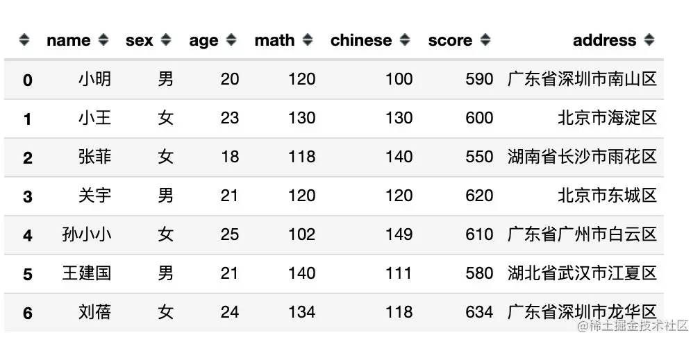 下面是完全模拟的一份数据,包含:姓名、性别、年龄、数学、语文、总分、地址共7个字段信息。
