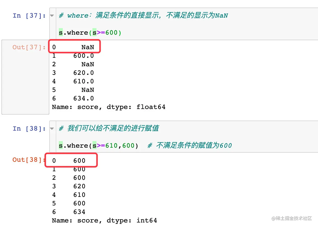 s.where(s>=610,600) # 不满足条件的赋值为600