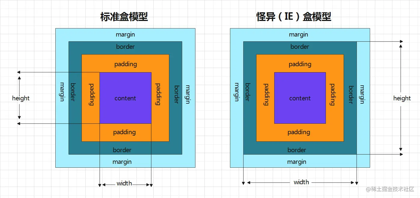 有两种盒模型,标准盒模型和怪异盒模型(IE盒模型)。区别在于,标准盒模型的宽高大小为content的大小,而怪异盒模型则为content + padding + border的大小。如图所示: