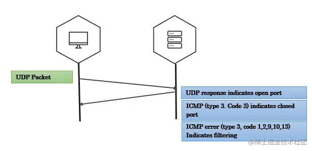 UDP扫描最常见于检测DNS,SNMP和DHCP服务。客户端会发送带有要连接的端口号的UDP数据包。如果服务器使用UDP数据包响应客户端,那么该端口在服务器上是开放的。如果返回ICMP端口不可达的类型为3和code为3错误数据包,表示该端口在服务器是关闭状态。