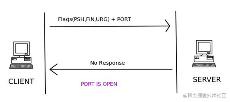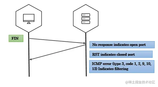 客户端会发送带有fin标志(关闭连接)的数据包到服务端,当服务端没有响应时,表示端口是开放状态,否则会收到rst的包。