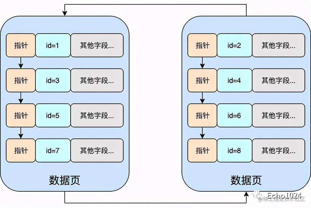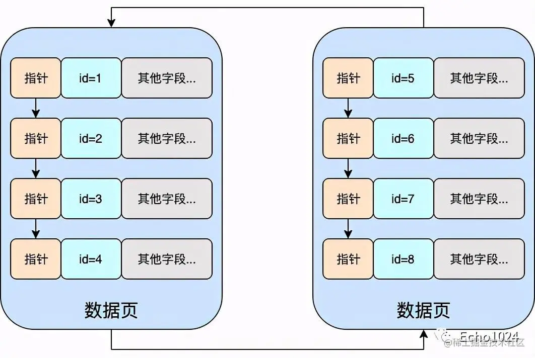 没错,数据页中存储着真实的数据,而且数据页在内存中是以双向联表的方式组织起来的!如下图