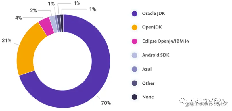 2018年12月,由 Snyk 和 The Java Magazine 联合推出发布的 2018 JVM 生态调查报告 显示有 70% 的用户使用 Oracle JDK,21% 的用户使用 OpenJDK。其中 Java 8 的使用者占到了 79%。