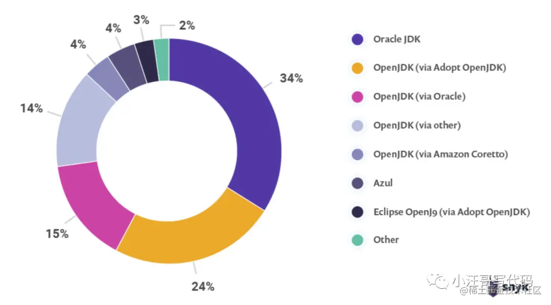 2020 年 2 月,由 Snyk 和 The Java Magazine 联合推出发布的 2020 JVM 生态调查报告 显示有 34% 的用户使用 Oracle JDK,57% 的用户使用 OpenJDK。其中 Java 8 的使用者依然维持在 64% 过半数的水平。