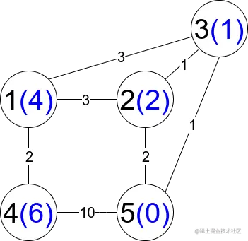 输入:n = 5, edges = [[1,2,3],[1,3,3],[2,3,1],[1,4,2],[5,2,2],[3,5,1],[5,4,10]]