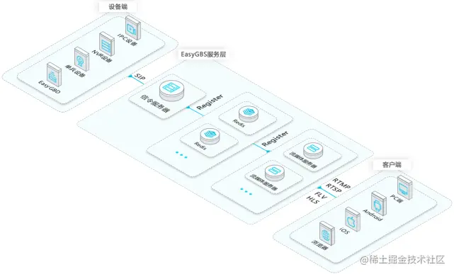 整套方案的架构中,涉及到前端设备(摄像机IPC、硬盘录像机NVR、编码器等)、流媒体服务端(EasyGBS国标视频云服务)、客户端终端设备(PC、浏览器、Android、iOS、微信等)。