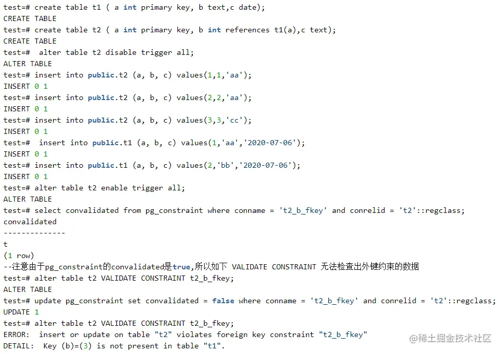 通过上面的测试我们可以知道,在对约束禁用期间,约束记录的状态为已验证,此时我们可以直接更新系统表 pg_constraint。