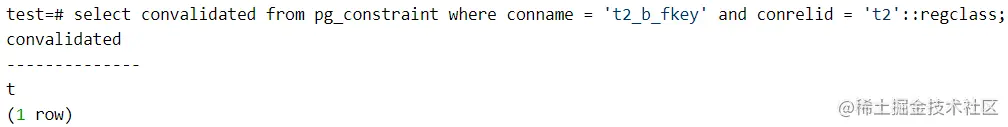 通过查看系统表 pg_constraint,我们可以看到约束记录的状态为已验证。