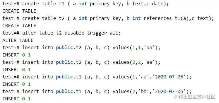 这里数据本身并没有问题,只是当时恢复表数据时候首先恢复了 t2 表导致了违反外键约束的报错,此时我们可以首先禁用 t2 表上的外键约束并在加载对其进行验证。