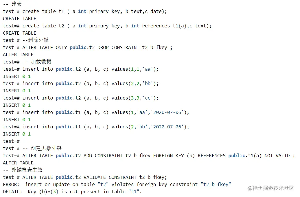 这样的方式,创建无效外键对后续新插入和更新的数据有约束作用,在外键检查时对之前存在的数据可以进行检查,从而保证所有的数据符合外键约束。