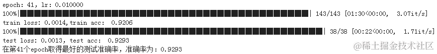 这里的结果就只截部分了。我们设定了训练100个epoch,batchsize设定为128。这里需要说明的是使用大的batchsize的同时要将学习率也设置大些,我们设置初始的学习率为0.1。并在第40个和第80个epoch进行学习率衰减,每次变为原来的0.1呗。也要切记并不是batchsize越大越好,虽然大的batchsize可以加速网络的训练,但是会造成内存不足和模型的泛化能力不好。