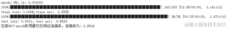 在此之前,我们还要优化一下我们的训练测试代码。一般情况下,我们只需要关注每一个epoch的结果就行了,可以将输入每一个step的那段代码注释掉,但是,这也存在一个问题。每次只打印出epoch的结果,有可能一个epoch要执行的时间很长,注释掉step之后没有反馈给到我们。那应该怎么办?使用python库tqdm。它会以进度条的形式告诉我们一个epoch还有多久完成,以及完成所需的时间。