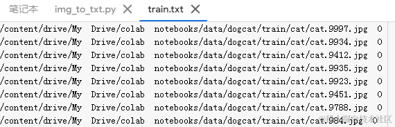 其中os.listdir()用于获取路径下的文件夹列表,['cat','dog']。glob()用于获取目录下的所有匹配的文件。为了能够按顺序对类别进行数字标记,需要对目录列表进行排序。然后我们将cat标记为0,dog标记为1。并将图片对应的路径和标签加入到txt中。