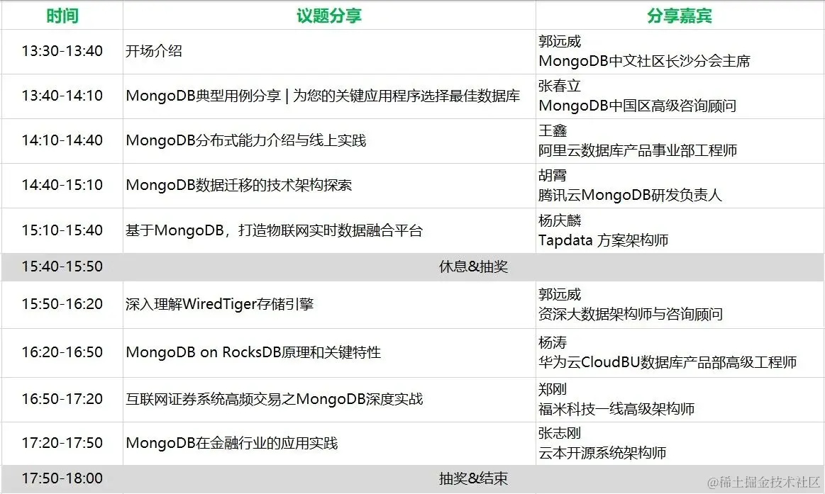 详细议题及嘉宾介绍请点击此处进行阅读:【议程来了】2021年MongoDB长沙大会邀您相聚岳麓,共话mongo!