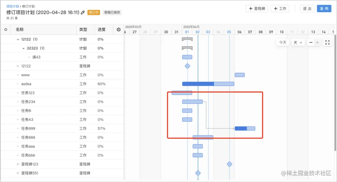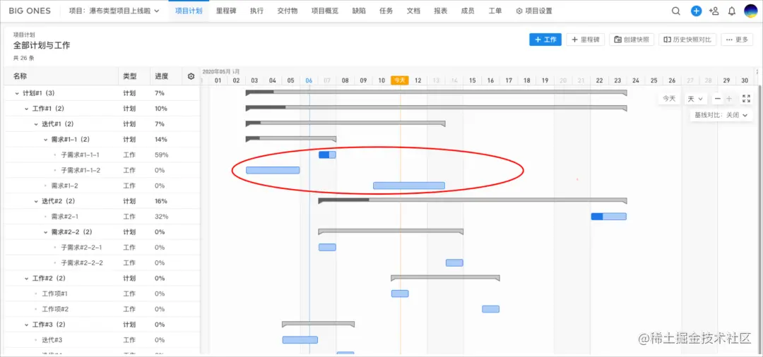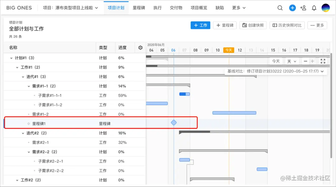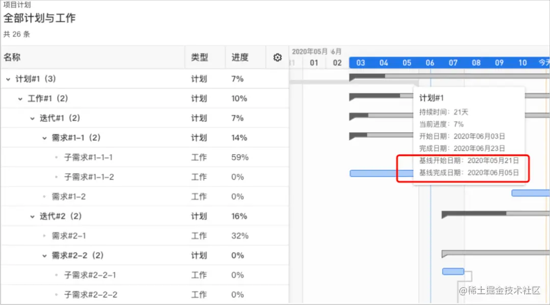 3. 添加成功后,可通过具体工作或里程碑的 hover 提示查看开始日期和完成日期的对比情况。
