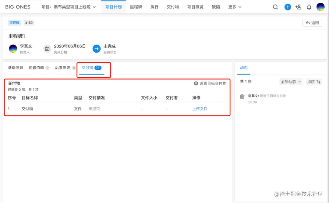 在甘特图中设置里程碑,通过里程碑将项目进度分解为不同阶段的目标,用以度量项目进度,确保项目总目标实现。项目经理可以创建和管理交付物,并关联到相应的里程碑,ONES 支持将交付物设置为文件或链接。每一份交付物的完结标志着该阶段的工作已完成,研发工作可以进入下一阶段。