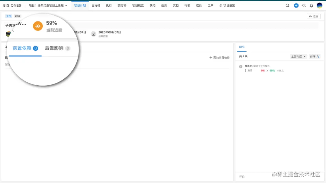 1. 在工作和里程碑的编辑详情中,点击「添加前置依赖」或「添加后置影响」即可为当前工作或里程碑添加前后置关系,计划不可添加前后置关系;