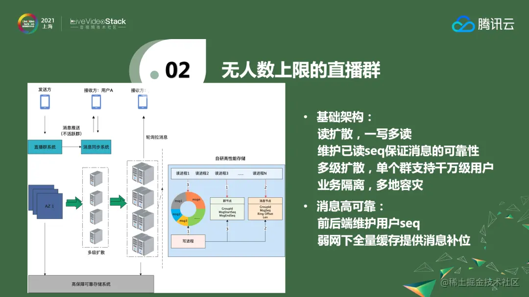 在做微信视频号的时候,有提到如果把一亿个人拉到一个群里会怎样?这一定需要读扩散的模式,写扩散是完全不行的,这也是腾讯云即时通信IM的一个特色——无人数上限的直播群,很多客户都会用到。这是一个基本的交互逻辑,看起来只是比较简单的系统收发,里面其实存在多级扩散。当收到消息后,经过逻辑层的扩散,将其存储到一个类似数据存储层的结构里——这个数据存储层可以储存2分钟或者5分钟的一段时间内全部的消息,当用户来拉取的时候,会按照就近的方式拉取。我们这里对消息采取一写多读的方式,具体的消息是一个环形的BUFFER,会记录消息的偏移量,直播大群的群号、群ID、群消息的范围也在里面。另外,网络通信会有抖动和丢包,所以我们做了一个兜底的策略,将消息保存在高保障可靠存储系统,当发现消息的SEQ出现断层,可以补拉,从而保证消息的高可靠。