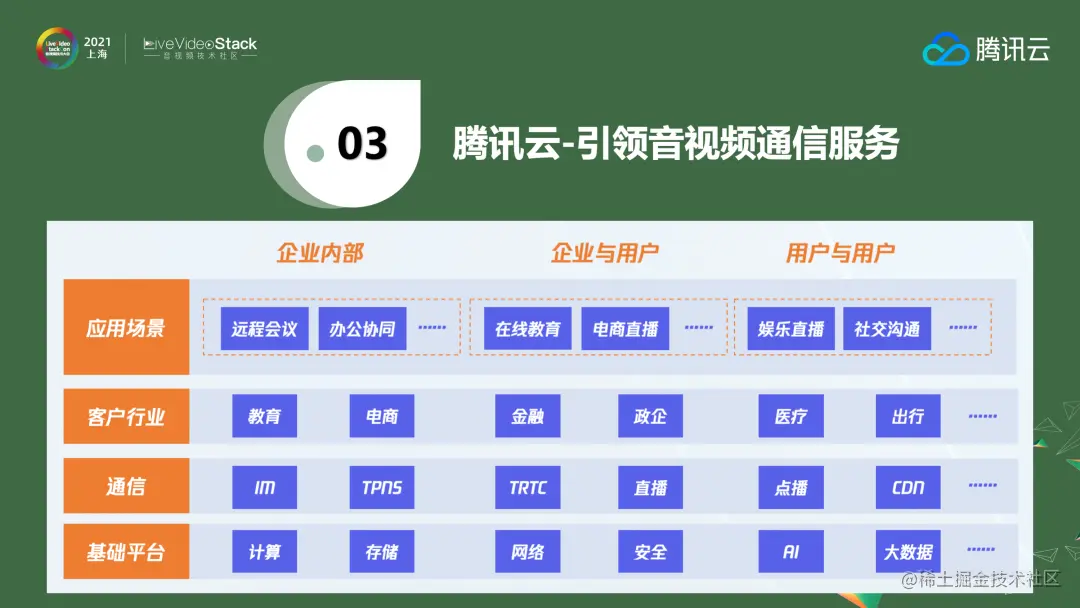 上图是腾讯云底层能力。通信层我们有IM、移动推送、实时音视频、直播、点播、CDN的能力,面向教育、电商、金融、政企等各个行业的客户提供服务。服务主要分为三类:一是企业内部员工办公、二是企业和客户之间、三是用户和用户之间。此外,腾讯云还有PSTN、一键登录、云呼叫中心和短信等其他通信能力。从行业来看目前腾讯云已经是全国最大的综合通信服务商。