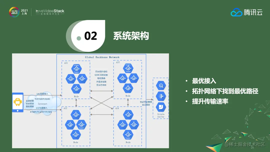 如果想打造高速的网络,不仅需要了解如何选择一个最近的点,还需要知道如何在路由之间快速地交换以到达自己的源站。有三个核心点——如何选择最优接入、如何选择最快的路由以及如何提升传输速率。