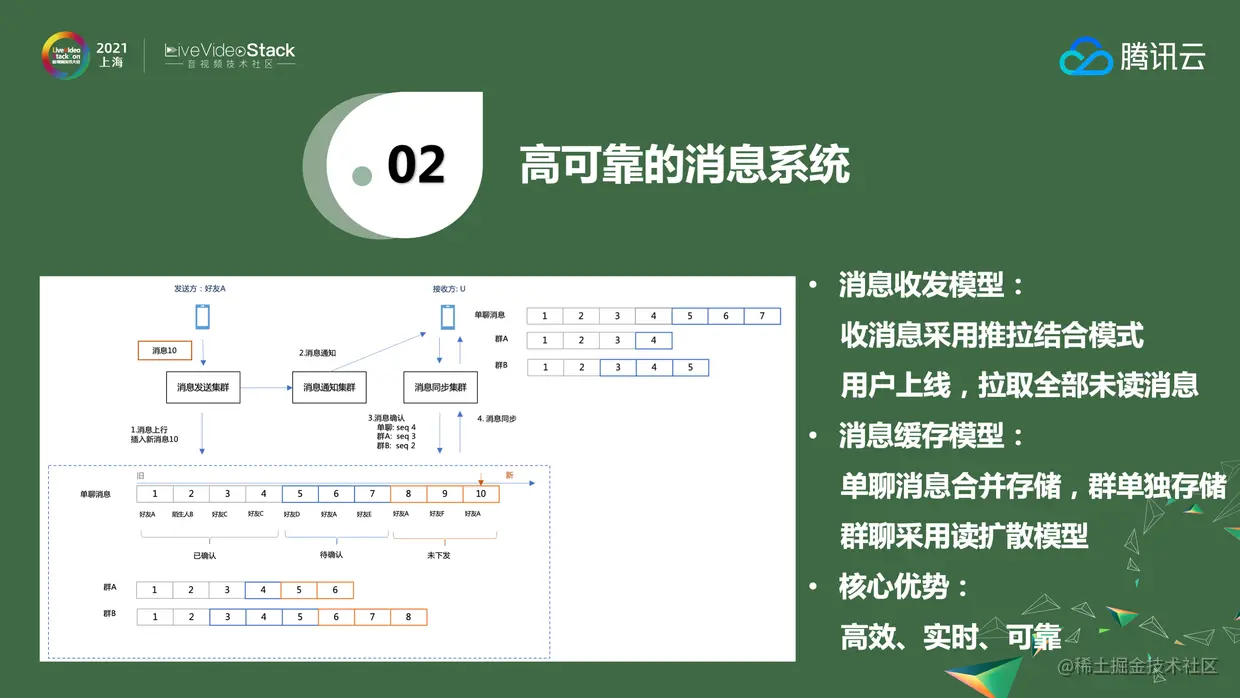 腾讯云选择的是读扩散的模式。从上图可以看到,对于收件人来说,以收件人为维度来储存消息;对于群来说,是以群为维度储存消息。消息的状态一共有三种——已确认、未确认和待下发。收消息采用推拉结合的方式,当一个消息出现,会把消息内容和通知发给接收端,接收端再上传把消息拉回来。这里面会有sequence或者腾讯云自己的cookie控制时序的问题。对于群聊,目前是通过读扩散的模型。如果群比较小,写扩散确实比较方便,但当群的数量越来越大,比如微信群的数量上限是500人,可以使用写扩散,而微信的视频号和直播要使用写扩散的模式是行不通的,很多都已经改成了读扩散的模式。腾讯云不仅可以支持500人的群,2000人乃至万人的大群都能支持。