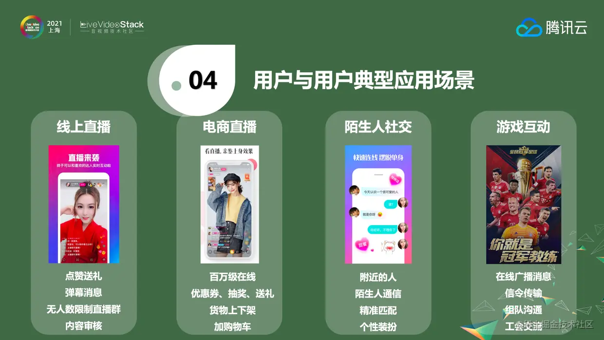 用户与用户之间的场景会更多,像线上社交直播、电商直播带货等等。电商直播会更多需要无人数上限的直播间,会有优惠券、抽奖、送礼、货物上下架、加购物车的诉求。陌生人社交场景会有附近的人、陌生人通信、精准匹配、个性装扮等等诉求。另外在游戏互动方面也有很多应用场景。其实无论是直播、电商、陌生人社交还是游戏,都存在一个趋势:以前只是提供一个产品给客户使用就可以了,但是未来更多的产品会做社区,以此来维护和客户的关系,通过腾讯云的IM和TRTC可以很方便的把社区的通信能力搭建起来。