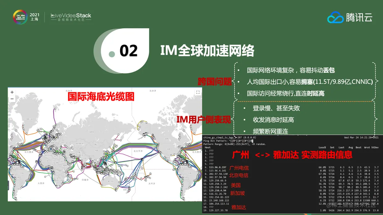 我国海底光缆现状有三点:首先,国际网络环境复杂,容易抖动丢包。其次,整个中国出口的带宽很小。《CNNIC第47次中国互联网报告》提到整个中国出口带宽大概是11.5T,虽然每年的增长速度很快,但是相比去年全球400T的规模还是非常小的。全球人口总计70多亿,互联网人口只有40多亿,中国可能只占据10多亿。对比可以发现中国人均的带宽非常低,经常出现拥塞问题。最后国际访问经常绕行,直连时延高。在这样的背景之下,IM会有登录慢、断网和消息延时的现象。