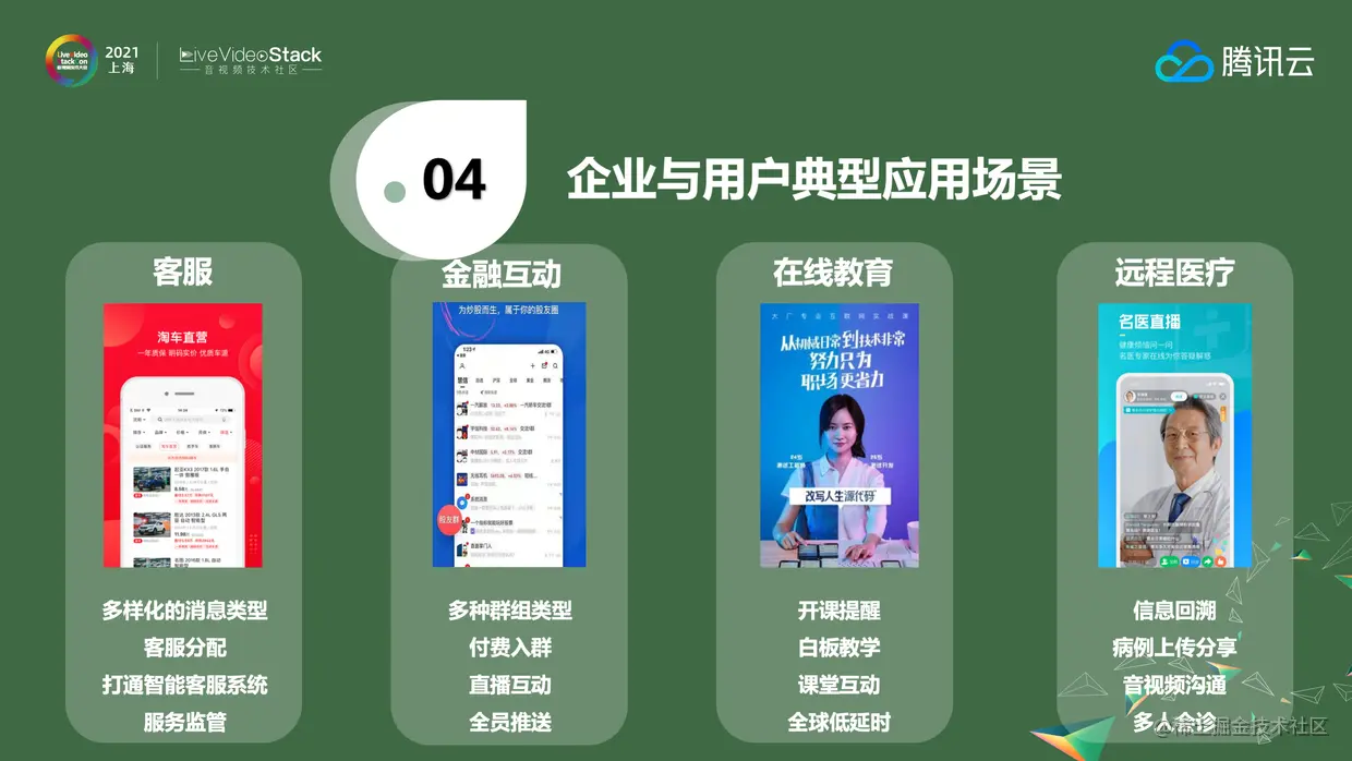 腾讯会议底层已经深度使用腾讯云通信的能力,包括主持人管理、消息和文件分享等等。在疫情期间,平安保险内训也是通过直播的方式把腾讯云的IM集成进去。钉钉、企业微信提供的是标准化的SaaS产品,但是很多客户因为业务场景原因会有更多的诉求和定制化的需求,为满足这些诉求,需要把腾讯云的IM、TRTC集成进去,基于业务场景灵活开发产品,例如企业内通信的场景。