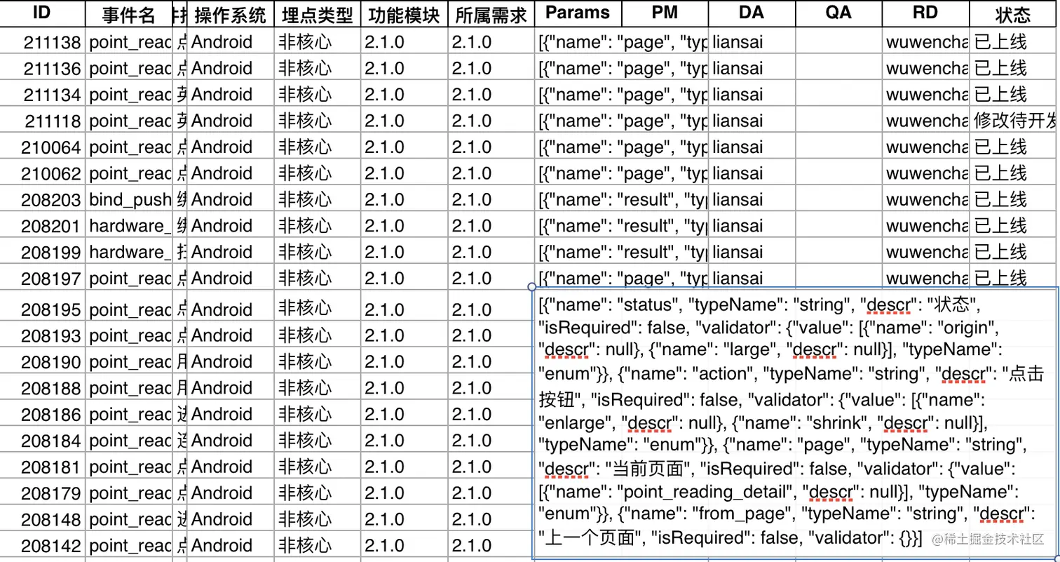 最终字节的埋点平台导出来的是一个excel文件,其中包含了埋点事件相关JSON格式的信息。对,你没看错。是JSON格式的。满满的幸福感~