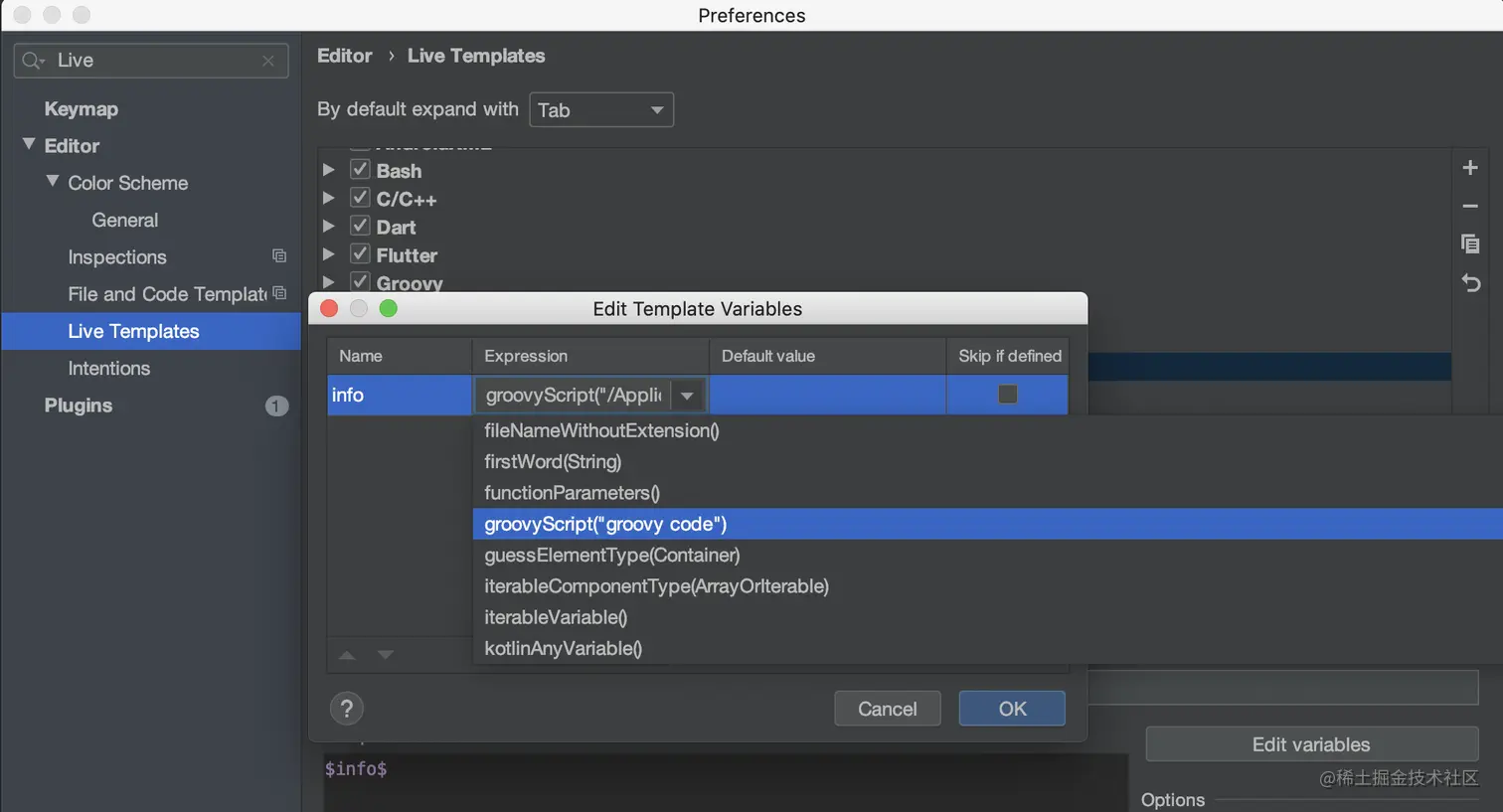 其实Live Templates是支持Groovy脚本的。有了Groovy脚本的支持,理论上其实我们能做的事情是无限多的。他就藏在我们可爱的Live Templates设置里面。