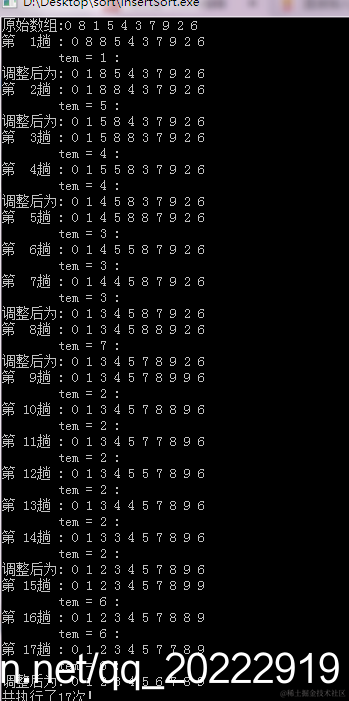 下面测试一下如果数组中的数最最坏情况下排序,看看用直接插入排序法需要多少趟。