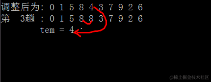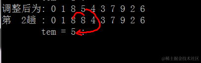 调整后为: 0 1 2 3 4 5 7 8 9 6