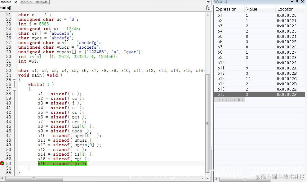通过上面的例子可以看到字符型和无符号字符型长度为都是1,整形和无符号整形长度都为2。字符数组cs的长度为8,其中字符长度为7加上结束符,共占8个字节。字符串指针pcs长度为3。后面的x9、x12、x16这三个都是指针,长度都是3,虽然x16是整形,x9、x12是字符型,但是在单片机内部依然都占用的3个字节的内存。x11占用了9个字节,x11是指针数组,其中里面总共有3个指针。说明一个指针也是占用3个字节。