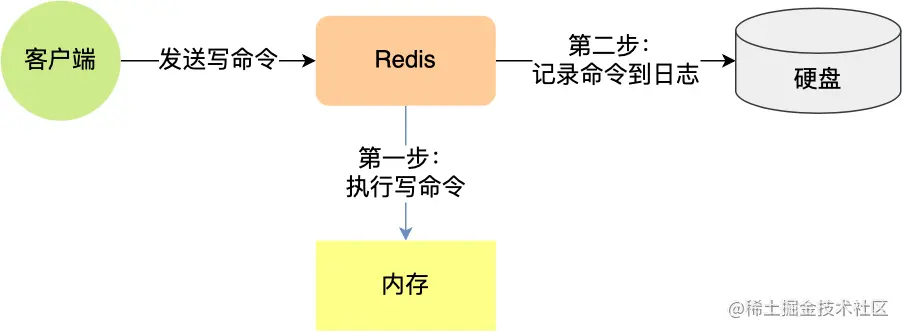 第一个风险,执行写操作命令和记录日志是两个过程,那当 Redis 在还没来得及将命令写入到硬盘时,服务器发生宕机了,这个数据就会有丢失的风险。