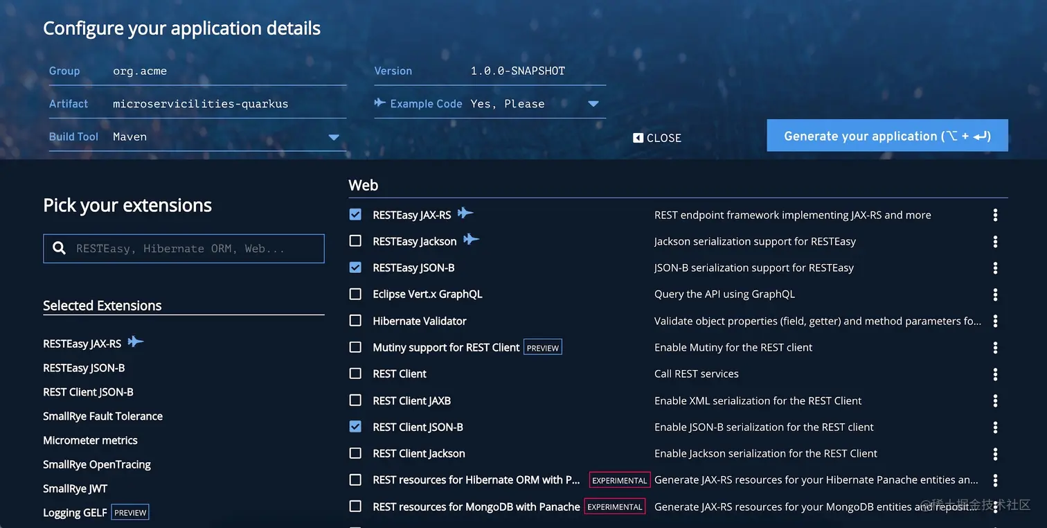 我们可以手动选择各自的依赖关系,或浏览以下链接 Quarkus 微服务特性生成器,所有这些都会被选中。然后按“生成应用程序”按钮以下载包含支架应用程序的zip文件。