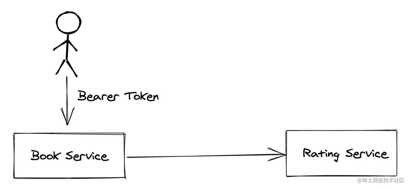 对于当前示例,仅使用两个服务生成了一个非常简单的应用程序。一个名为“评级服务 rating service”的服务返回给定书籍的评级,而另一个名为“书籍服务 book service”的服务则返回一本书的信息及其评级。服务之间的所有调用都必须经过身份验证。