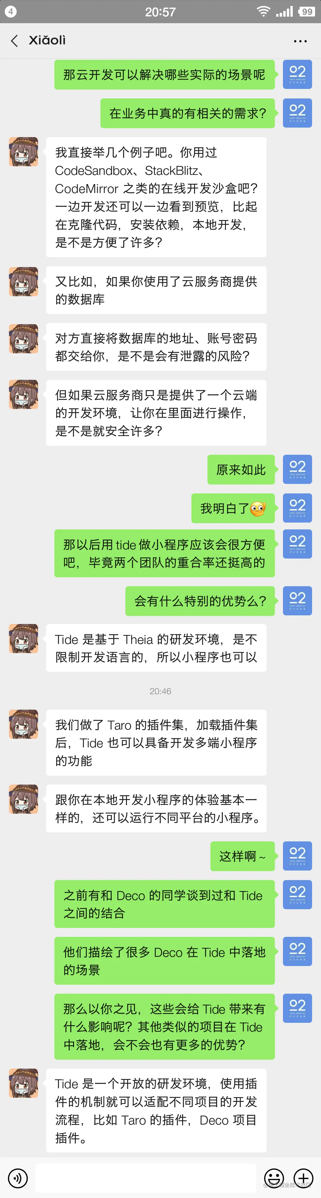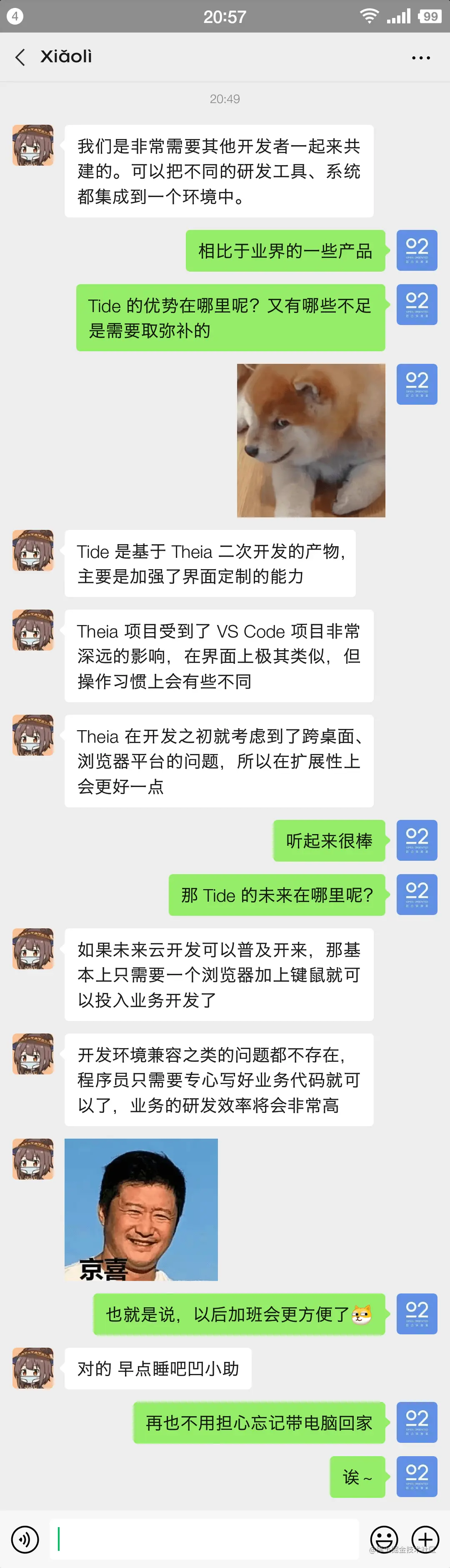Cloud IDE 已经不是什么新概念了,但是作为开发,它到底能够给我们带来什么?工程化和研发上云?选择云开发又会有哪些优势?很遗憾小助手也不太懂,不过近期有接到一个 Tide 插件的新需求,打算找 Tide 团队的童鞋调研一下。