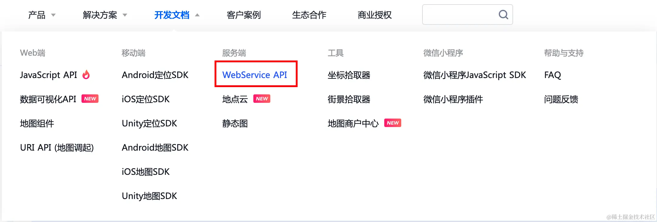 滑动到上方菜单的开发文档 -> 选择服务端下的WebService API: