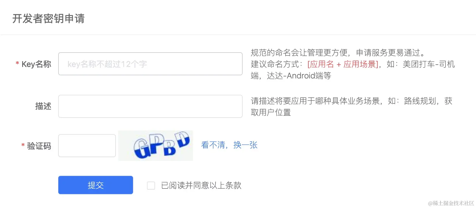 点击创建新密钥,填写Key名称、描述、验证码,等待审核通过: