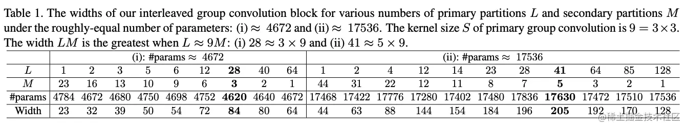 固定参数量意味着主分组卷积和次卷积的有效参数固定,当输入的特征维度更多时,卷积核也越大,卷积将变得更加稀疏,这可能导致性能的下降。为此,论文也进行不同配置的性能对比,具体见图3。