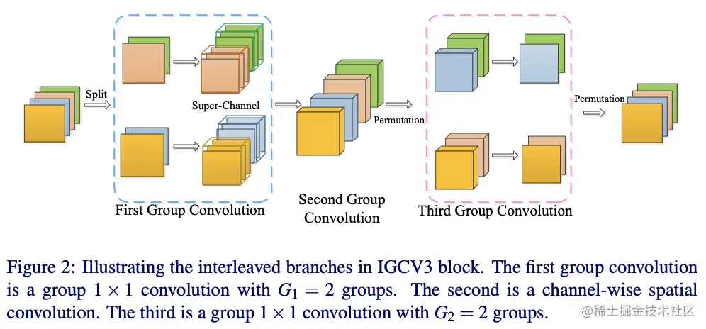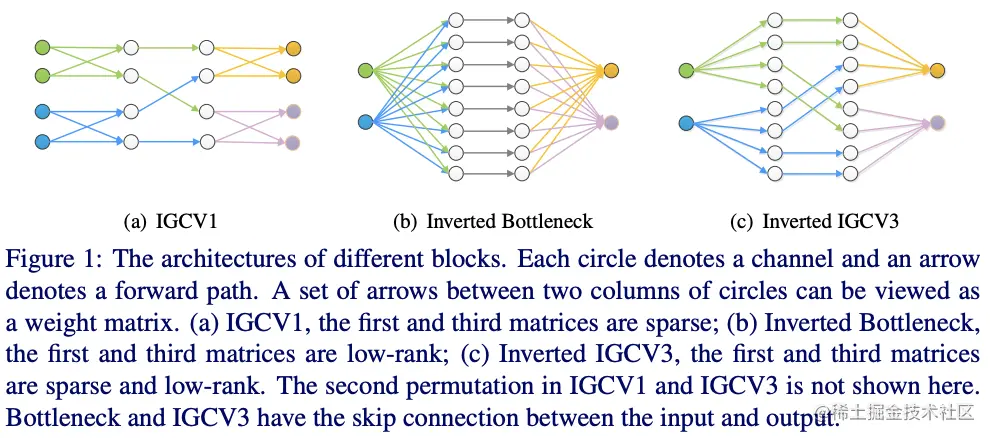 基于IGCV和bootleneck的思想,IGCV3结合低秩卷积核和稀疏卷积核来构成稠密卷积核,如图1所示,IGCV3使用低秩稀疏卷积核(bottleneck模块)来扩展和输入分组特征的维度以及降低输出的维度,中间使用深度卷积提取特征,另外引入松弛互补性原则,类似于IGCV2的严格互补性原则,用来应对分组卷积输入输出维度不一样的情况。