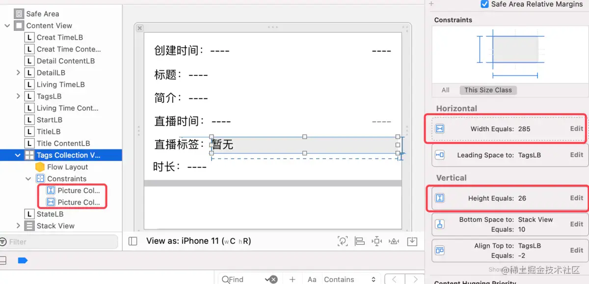 除了坐标位置外,重点设置UICollectionView的宽,高约束,这边随便设置个值(接近真实大小就行)。