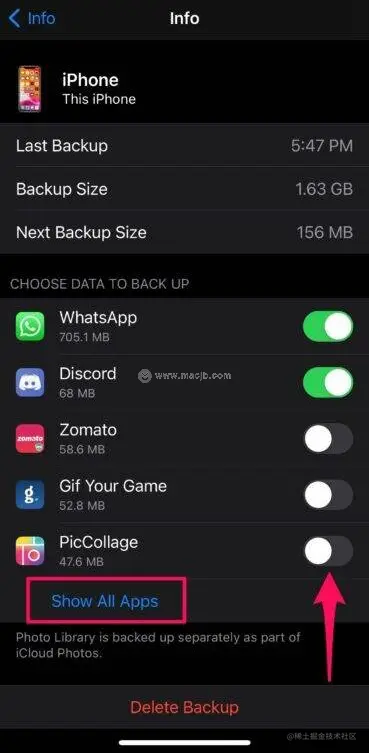 7.在这里,只需使用切换开关即可禁用不经常使用的应用程序的数据备份。取消选中的应用程序越多,下一次iCloud备份的大小就越小。